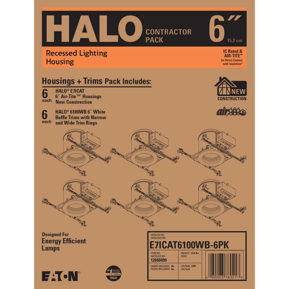 The E7ICAT is a compact and efficient recessed housing optimized and listed for EISA compliant tungsten-halogen lamps, as well as Incandescent, CFL and LED lamps. Housing is suitable for residential or light commercial applications. For installation in insulated ceilings and non-insulated ceilings with airtight code compliant construction. The 6100WB is a 6 in. tapered metal baffle with two rings narrow and wide.
