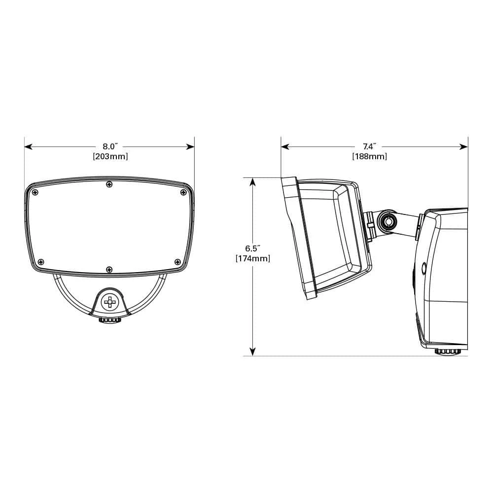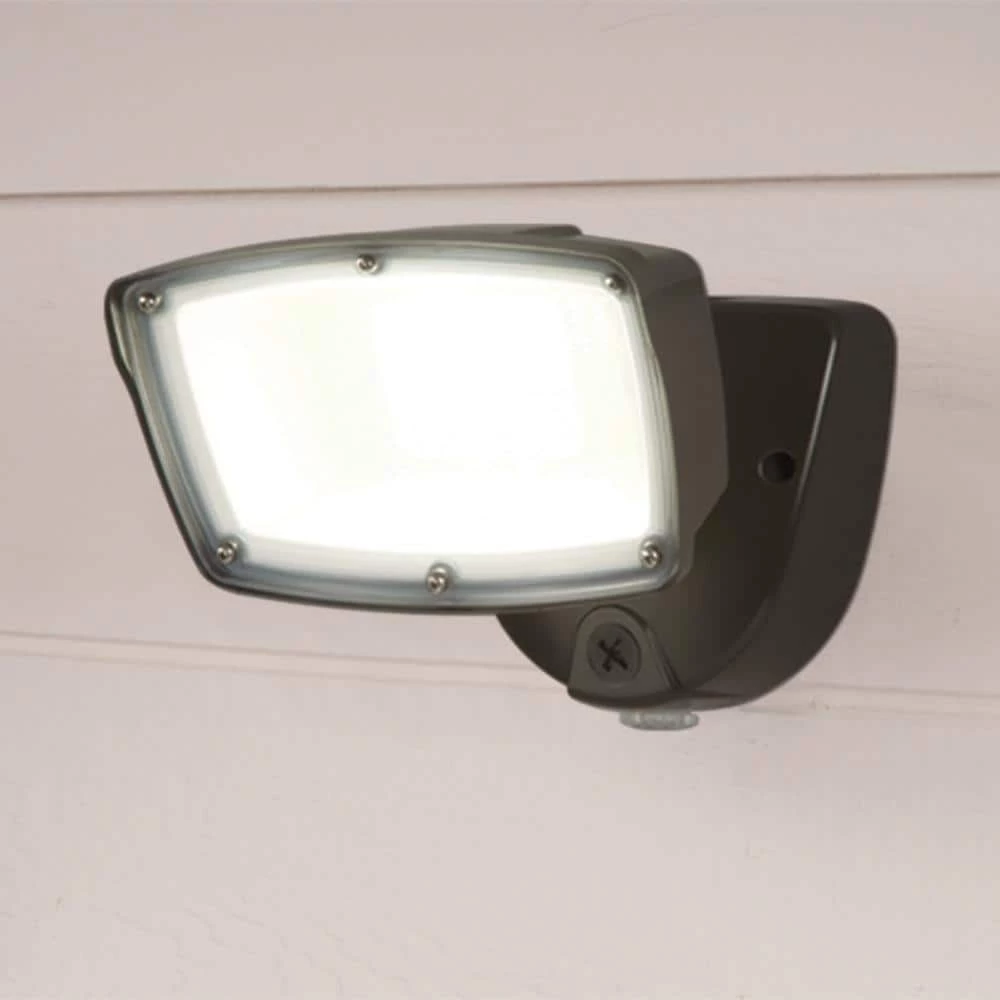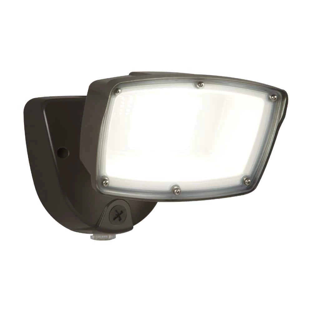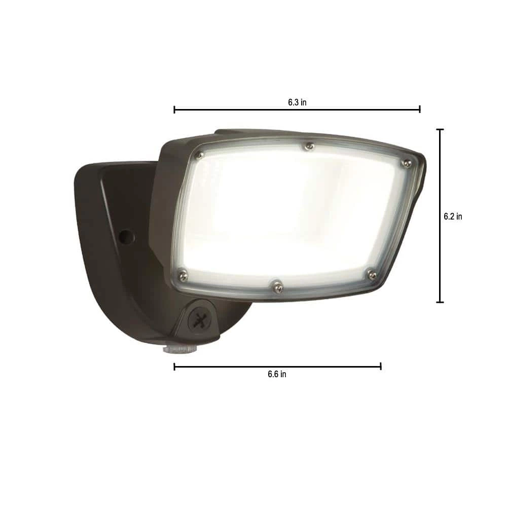The Halo LED large bronze single head floodlight utilizes selectable CCT functionality, advanced optics and multiple mounting options for a versatile outdoor lighting solution. 5800 Lumen output and dusk-to-dawn operation allows for a versatile application range from residential to light commercial. The durable die-cast aluminum housing is available in bronze or white powder coat finish, ensuring years of reliable, maintenance-free performance.