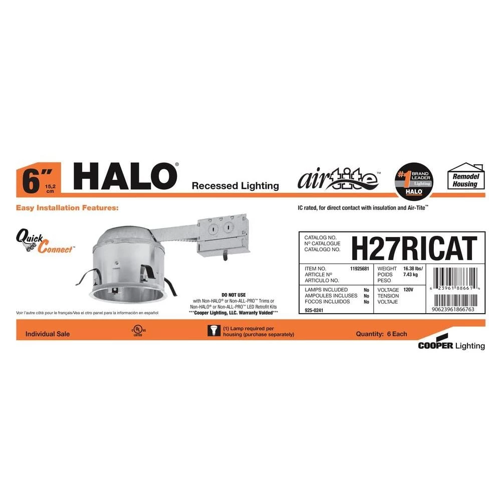 The H27RICAT housing is designed for remodeling use in shallow ceilings where 2 in. x 6 in. joist construction is used. The wide variety of trims available allows a number of different lighting effects to be created with one basic housing. The H27RICAT is designed for installations where the housing will be in direct contact with air permeable insulation.