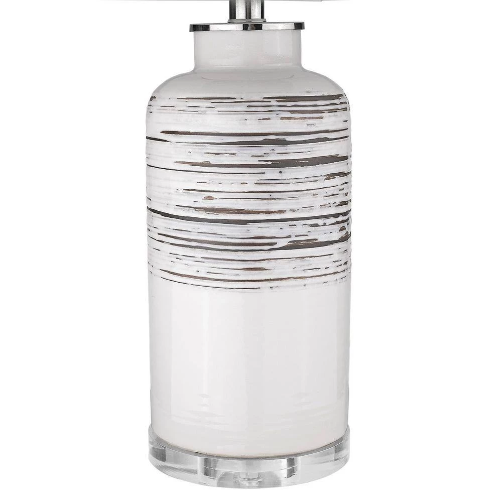 Table lamps not only illuminate a space, but they also add artistic character. This ceramic lamp features an elongated white, ceramic body with a complementing white fabric shade. This neutral design will lend itself to many styles.