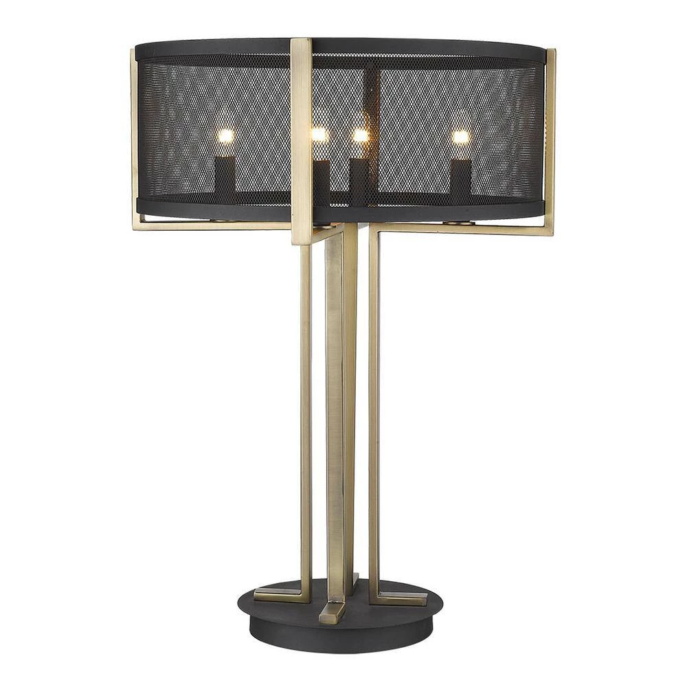 Reinvent your space by updating outdated lighting. Table lamps are a quick and easy way to add new life, and light, to a room. This table light features four vertical uprights finished in brass that tightly embraces a black, metal drum shade.