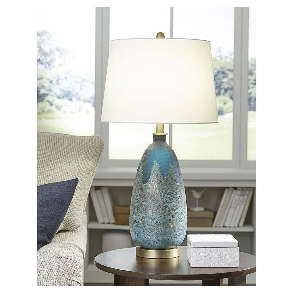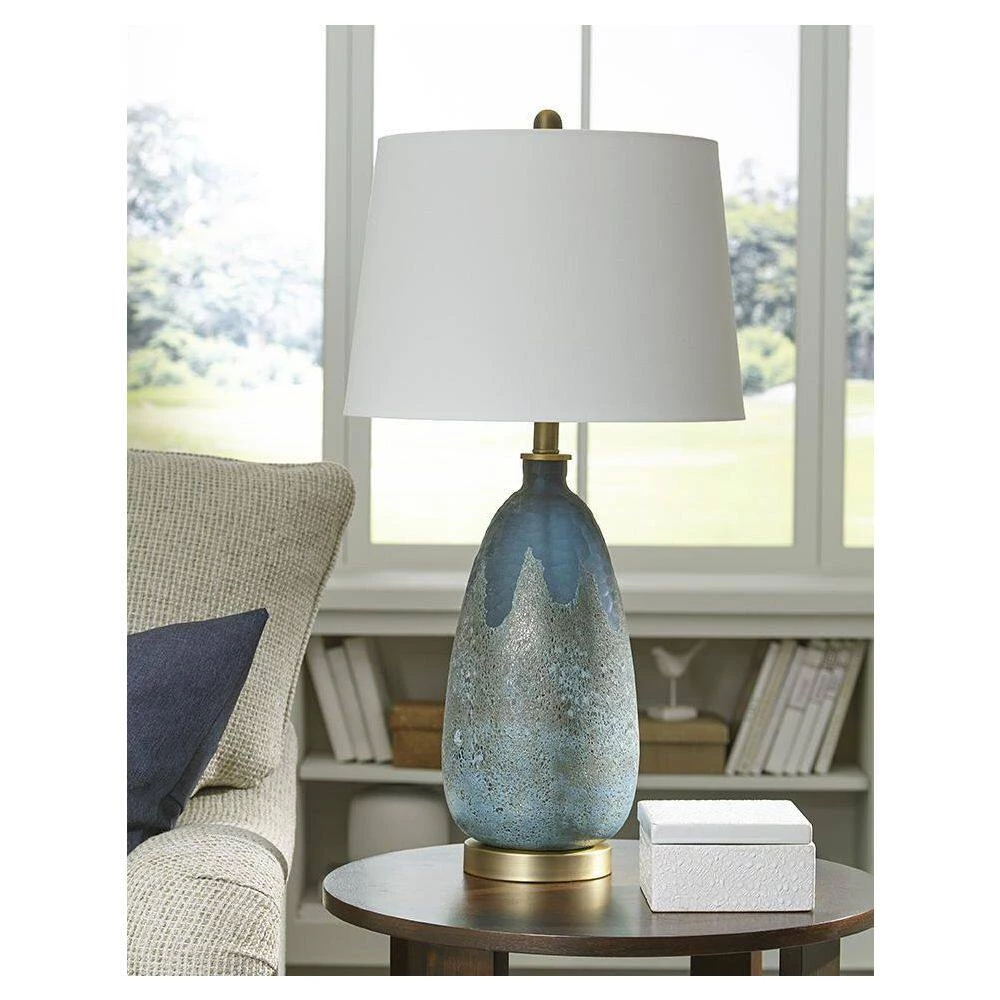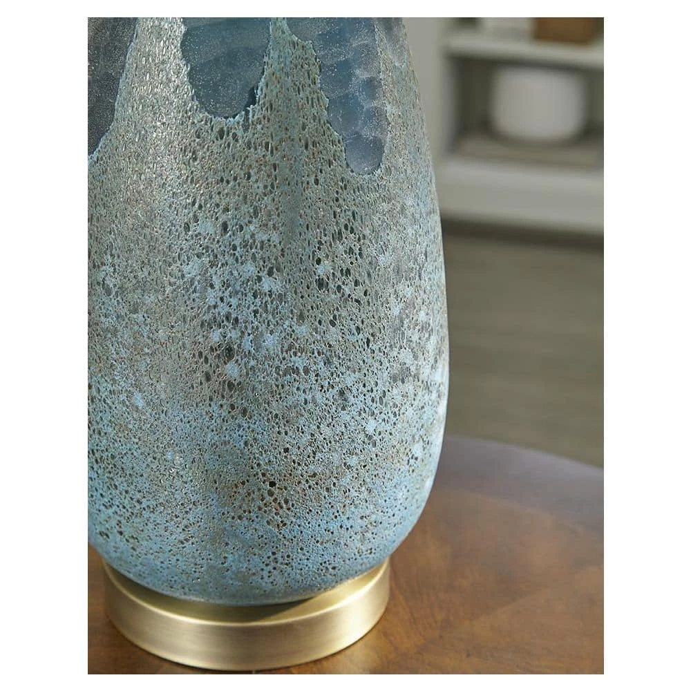Table lamps not only illuminate a space, but they also add artistic character. This table lamp features a dramatic two-tone glass body. Its lower body is of a raw concrete/glass combo which turns to a hammered glass in a deep teal/blue color at the top. Raw brass accents and a cream shade tie the look together.